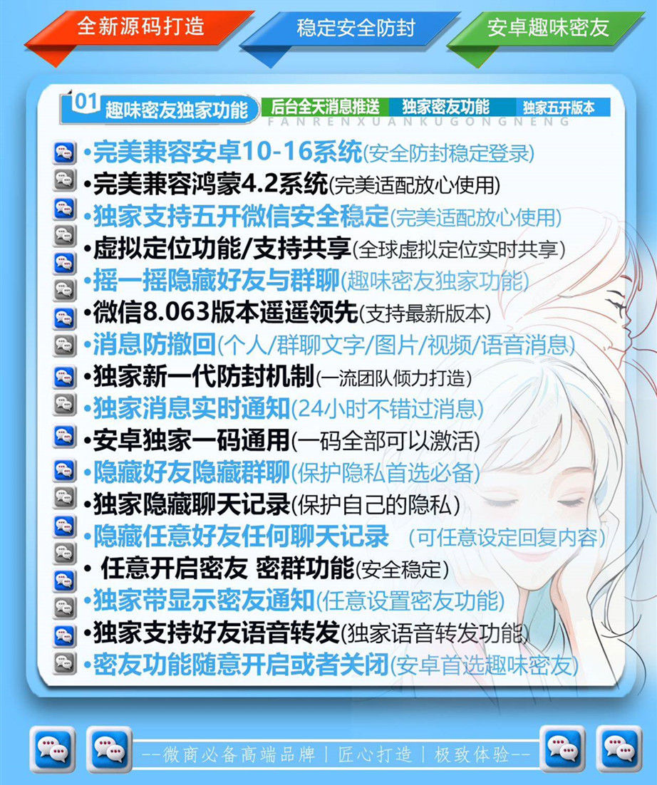 随着隐私问题的日益严峻,越来越多的安卓用户开始关注隐私保护。趣味密友为安卓10-16系统和纯血鸿蒙系统提供了强大的隐私保护功能,确保用户的通讯内容安全、位置数据不泄露,同时还能方便管理好友。文章源自致青春微商软件-https://www.ios85.com/3441.html